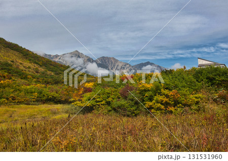 紅葉の黒菱平鎌池湿原と白馬三山 長野県白馬村