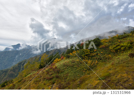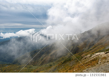 紅葉の八方尾根自然研究路と沸き上がる雲 長野県白馬村