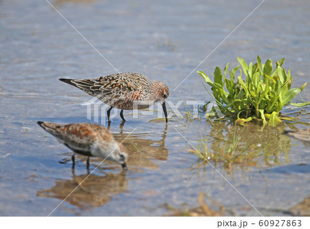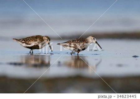 A pair dunlin feeding on the shore.