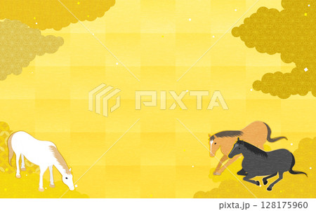 金箔風和柄背景に草をはむ馬と寄り添う馬の和風イラスト、2026年の年賀イメージ