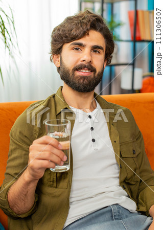 Thirsty middle eastern man at home holding glass of natural aqua make sips drinking filtered water