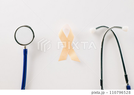 Pink awareness ribbon sign and stethoscope of International World Cancer Day campaign month isolated on white background with copy space, concept of medical and health care support, 4 February
