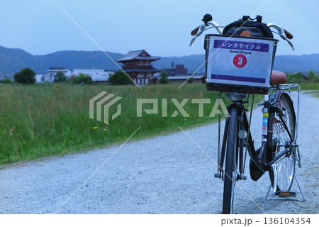 砂利道に止めてあるレンタサイクル(背景ぼけ)