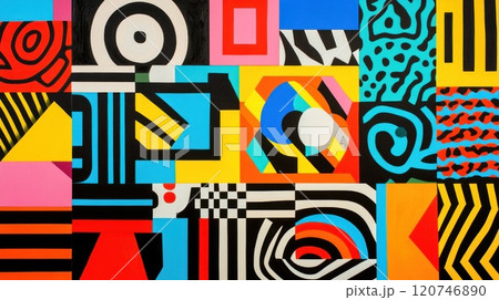 Vibrant abstract collage with geometric shapes and patterns in bold colors.