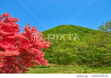春の群馬県榛名山(相馬山)の麓のスルス峠付近から相馬山とツツジを見る