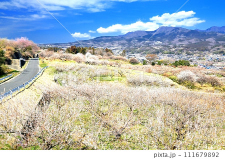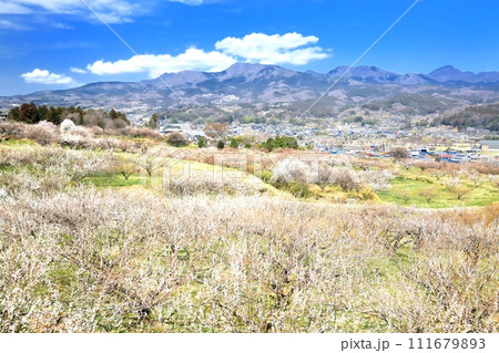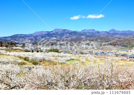 春の群馬県榛名山(相馬山)の麓から榛名富士と浅間山、浅間隠山方面を見る