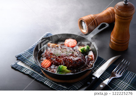 注)湯気は合成です。和風オニオンソースのハンバーグ、牛肉料理、肉料理。