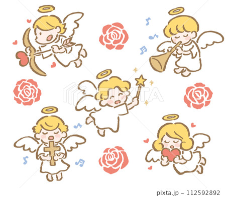 ゆるくてかわいい天使の子ども達とバラのイラストセット