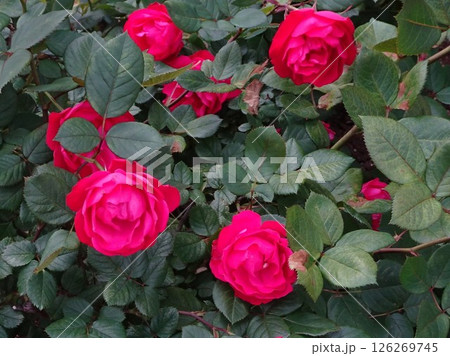 秋の美しい景色 カラフルに咲いた満開の秋バラ