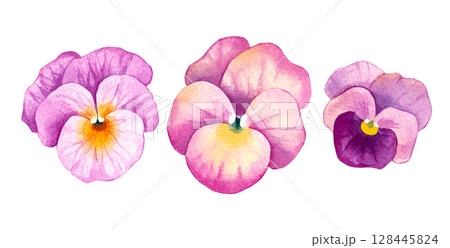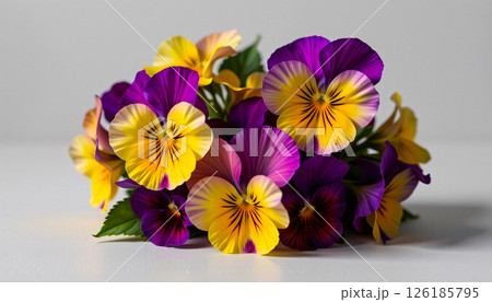 Elegant cluster of pansy in a minimalist style, with plum and soft yellow tones, smooth curves