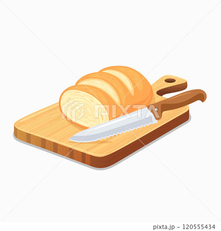 Flat Vector Wooden Cutting Board with Kitchen Knife Icon. Cutting Board and Knife Design Template. Chopping Board with Knife and Loaf of Bread Illustration Isolated on White Background