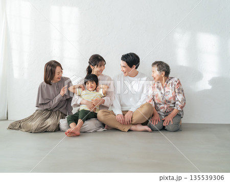 部屋でくつろぐ四世代家族