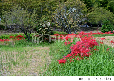 滋賀県高島市 琵琶湖畔へと続く園地に咲く秋の桂浜園地の彼岸花群生地