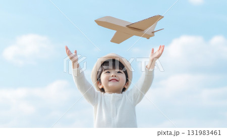 Happy Asian little child flying with cardboard toy paper airplane in the sky