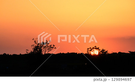 美しい夕暮れ空に映える沈む夕日風景と木 (コピースペース素材)
