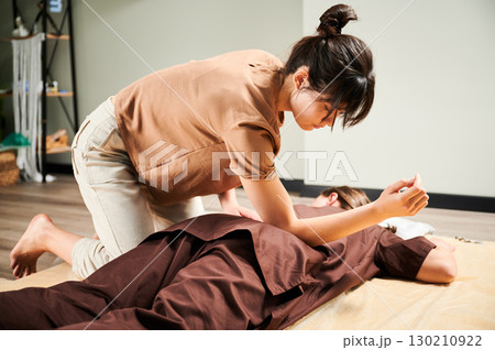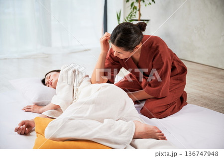 Masseuse making thai yoga massage. Woman therapist doing traditional massage treatment for female patient using elbow. Client lying on mat, meditating, enjoying hand massage in calm atmosphere.
