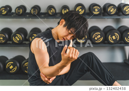 ジムでトレーニング中に肘を痛がる若いアジア人男性