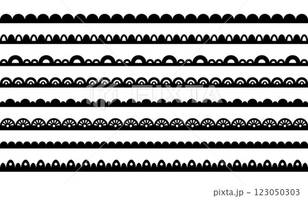 Lace border with scallop. Edge pattern for frame. Stripe of fabric with ornament. Black vector set of lines isolated on white background.