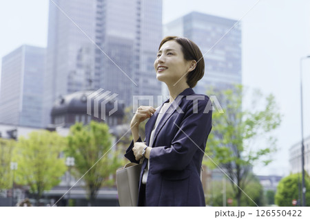 東京駅の前に立つ若いビジネスウーマン