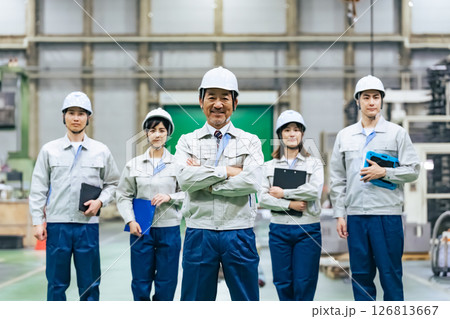 工場の中で並んで立つ作業員のグループ