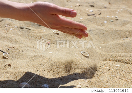 砂浜で砂を持つ手 手の中の砂が落ちていく様子