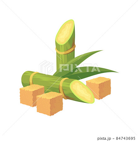 Sugar cubes with cane stalks. Sugarcane plants agriculture, cartoon vector flat icon illustration