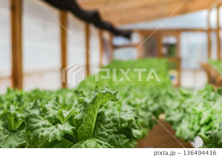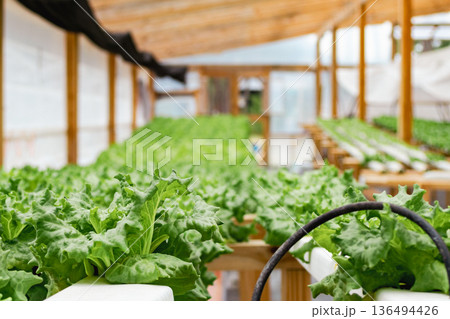Close up of rows of fresh green lettuce growing in a modern hydroponic system