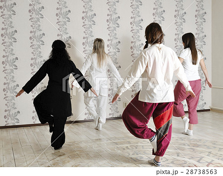 Group of young women in sports bras stretching side muscles while doing revolved side angle pose at class