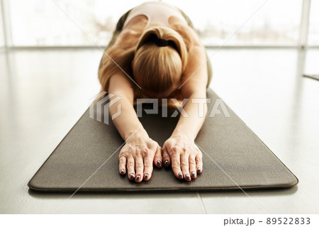 Flexible young woman in leggings leaning on hand and performing difficult yoga pose with raised leg