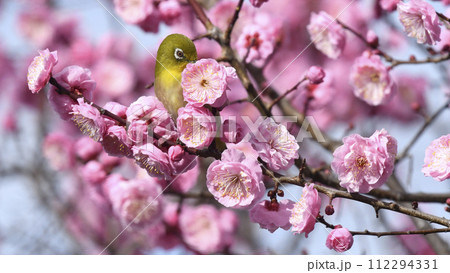 満開の紅梅を独り占めにするメジロさん ( 春イメージ )( 春うららかイメージ )