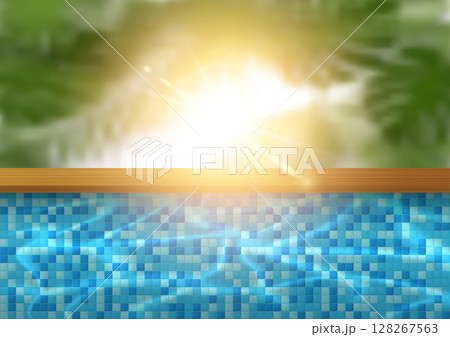 Pool party horizontal poster with tropical leaf and blue mosaic tile pool water. Summer vacation design template. Jungle palm resort background vector design. Summer sun light effect