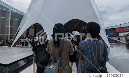 万博会場でパビリオンに並ぶ人々