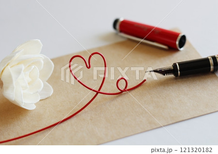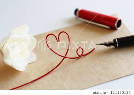 白いソラフラワーと茶色のメッセージカード 赤い万年筆で書くイメージ 赤いハートのワイヤー