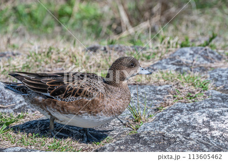 琵琶湖岸の陸上で草を食べるヒドリガモ