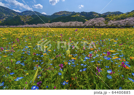 田んぼを使った花畑と那賀川の桜 静岡県賀茂郡松崎町