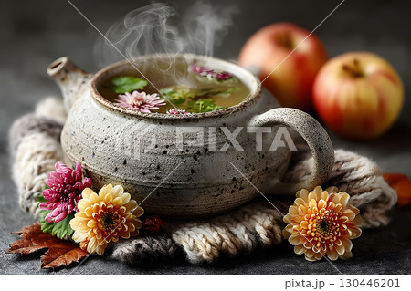 Cozy Autumn Tea Scene with Rustic Teapot, Apples, and Chrysanthemums for Seasonal Decor Generative AI