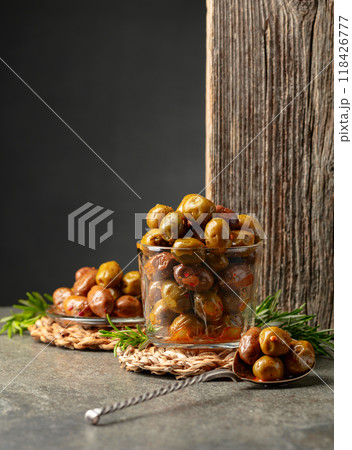 Homemade tomato sauce is an appetizer with tomatoes and hot peppers in a jar on a light background