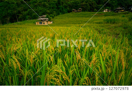 Green rice fields surrounding traditional rustic homes nestled within undulating hills where local agricultural communities maintain sustainable farming practices amid serene natural beauty.