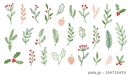 Christmas plant leaf, flower set. Hand drawn doodle sketch holly floral, christmas tree leaves, winter branch elements. Holiday decoration, rustic wreath sketch doodle. Vector