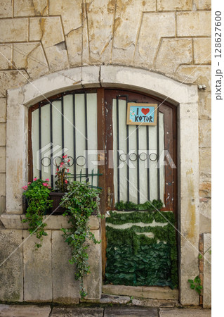 Kotor, Montenegro - 04.29.2025: old rustic door in stone wall at Kotor old town