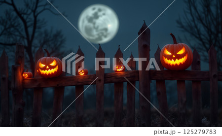 wooden fence decorated with pumpkins for Halloween, in the night forest, on the background of the moon