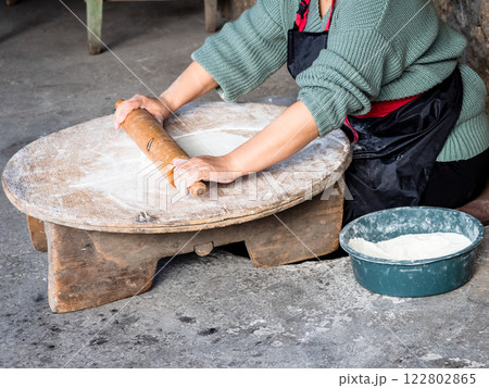 woman rolls out dough with wooden rolling pin