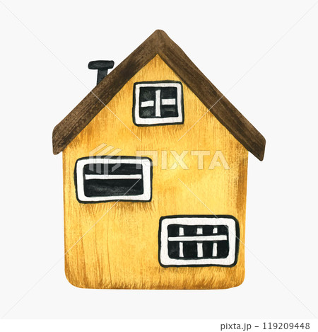 Small cute cartoon yellow house isolated on white background. Watercolor stylized children's illustration drawn by hand. Cozy small wooden cottage in Scandinavian style. Fishing village. Vector