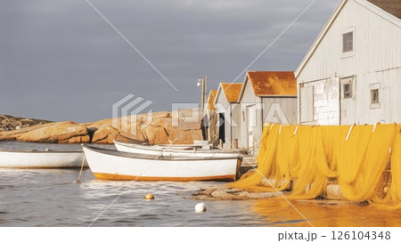 Fishing boats and colorful nets near coastal buildings.