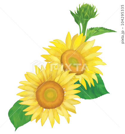 ヒマワリ ひまわり 向日葵 植物 真夏 夏 夏の風物詩 花 黄色 元気 満開 緑の葉 花畑 ヒマワリ畑 水彩 白バック 夏休み 明るい 花びら 常夏 かわいい たくさん 複数 希望 元気 夏イメージ