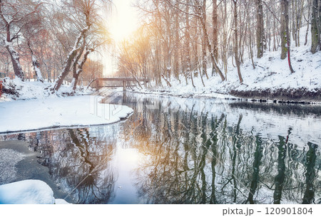 Outstanding landscape in city park with snowy trees and beautiful reflection in frozen river.