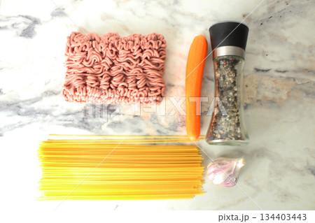 Meat, minced meat, spaghetti, carrots, garlic, spices, pepper, top view. Layout of products for cooking pasta