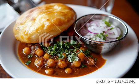 Healthy Chole Bhature tasty Indian dish made using wheat flour is arranged in a porcelain plate