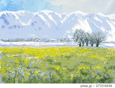 滋賀県の魅力 早春の比良山と菜の花畑 スケッチ