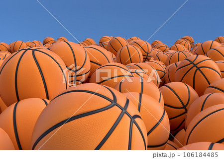 Many of flying orange basketball ball falling on blue background